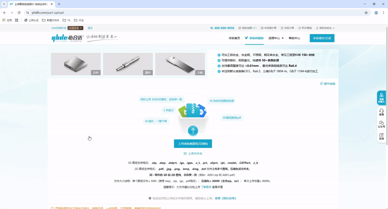 2、点击“上传或拖拽图纸/压缩包”“上传文件”,同时上传零件的3D和2D图纸(名称保持一致),可以支持图纸、压缩包、文件夹的批量上传