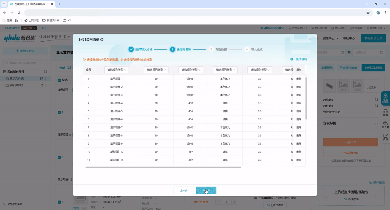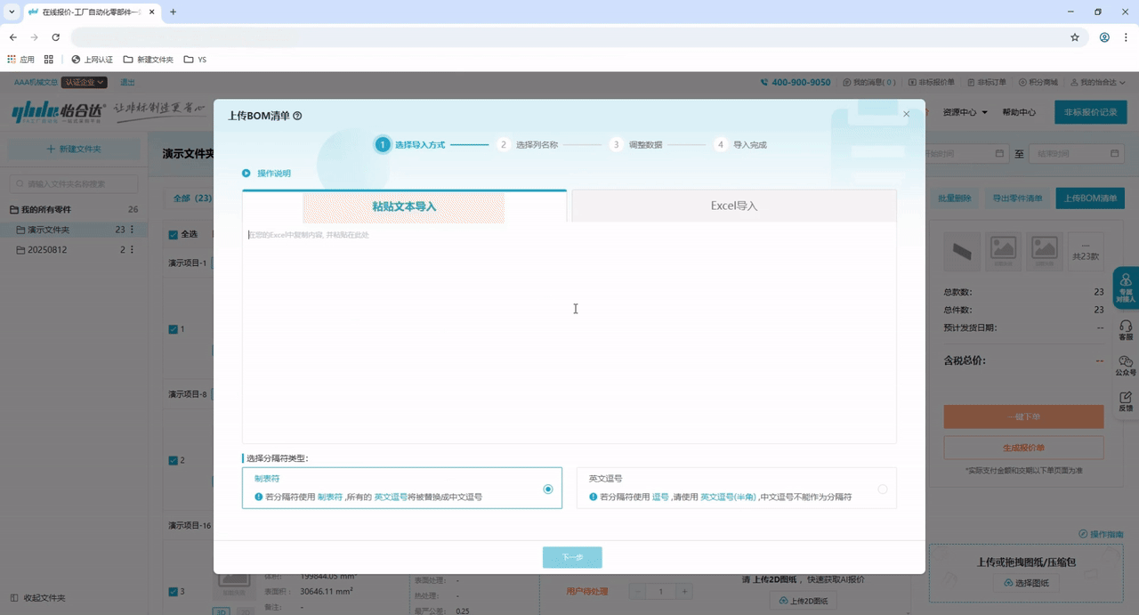 步骤4:复制准备好的参数(文本内的图纸名称要与已上传的图纸名称一致,以便系统进行匹配),粘贴到文本框内,并点击“下一步”