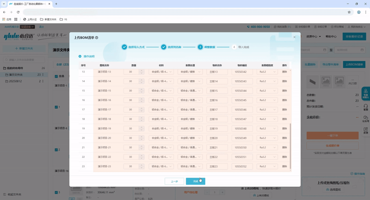 步骤6:再次检查参数,确认无误后点击“完成”,AI会根据新的加工参数计算报价