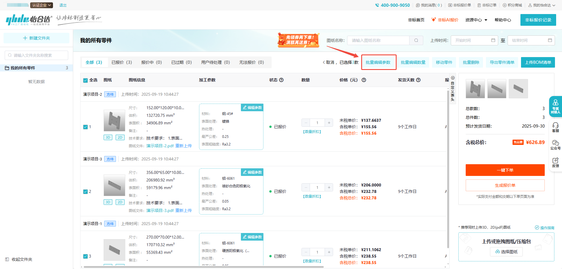 步骤3:选择材料、表面处理、热处理、最严公差、表面粗糙度、数量等参数,点击“确定”即可完成参数编辑,AI会根据新的参数重新计算报价