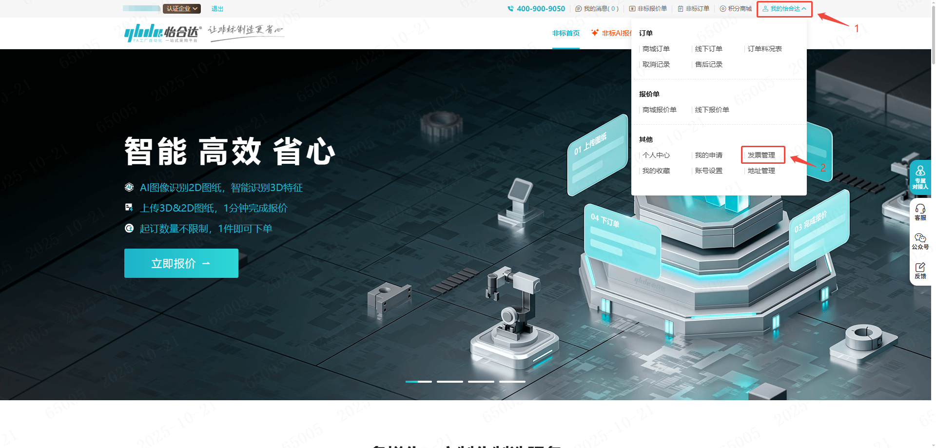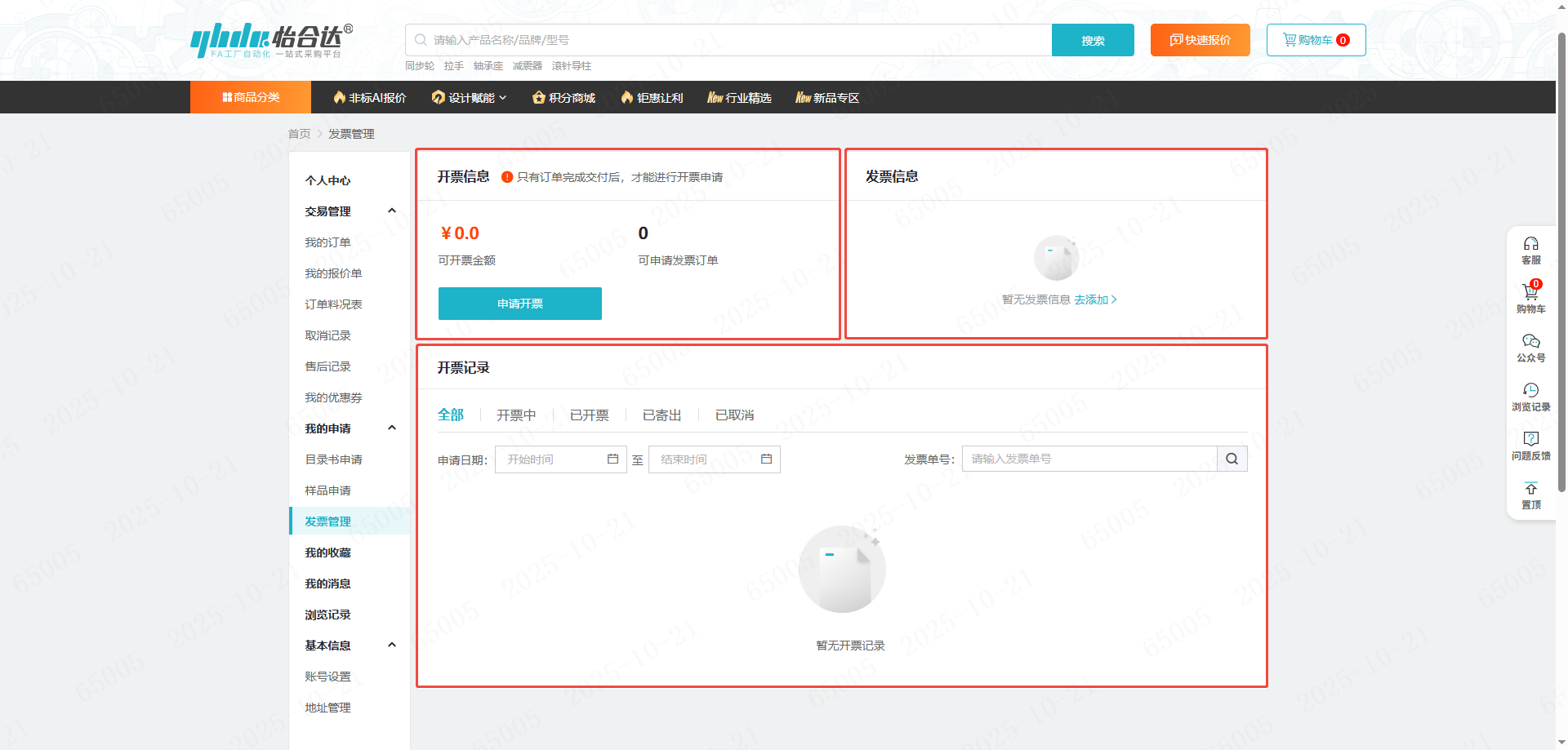 1、点击首页右上角“我的怡合达”-“发票管理”,进入到发票管理页面