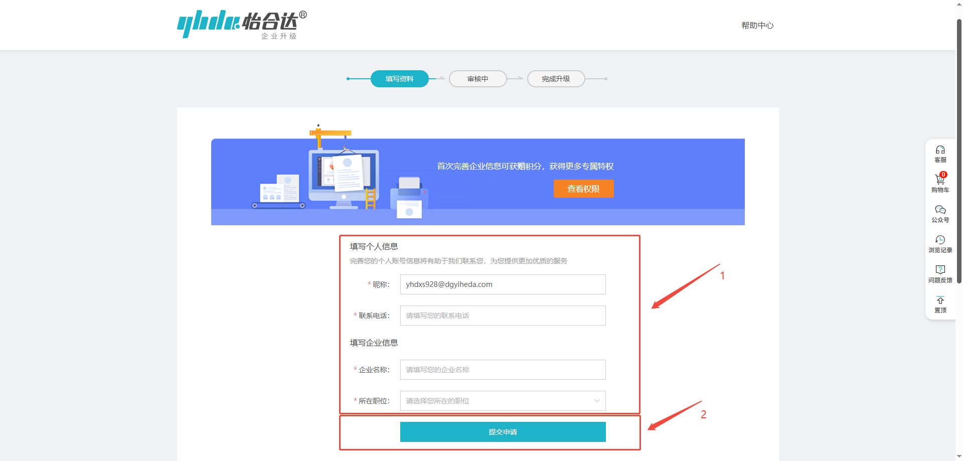 2、按照提示填写个人信息和企业信息,确认无误后点击“提交申请”,等待审核通过
