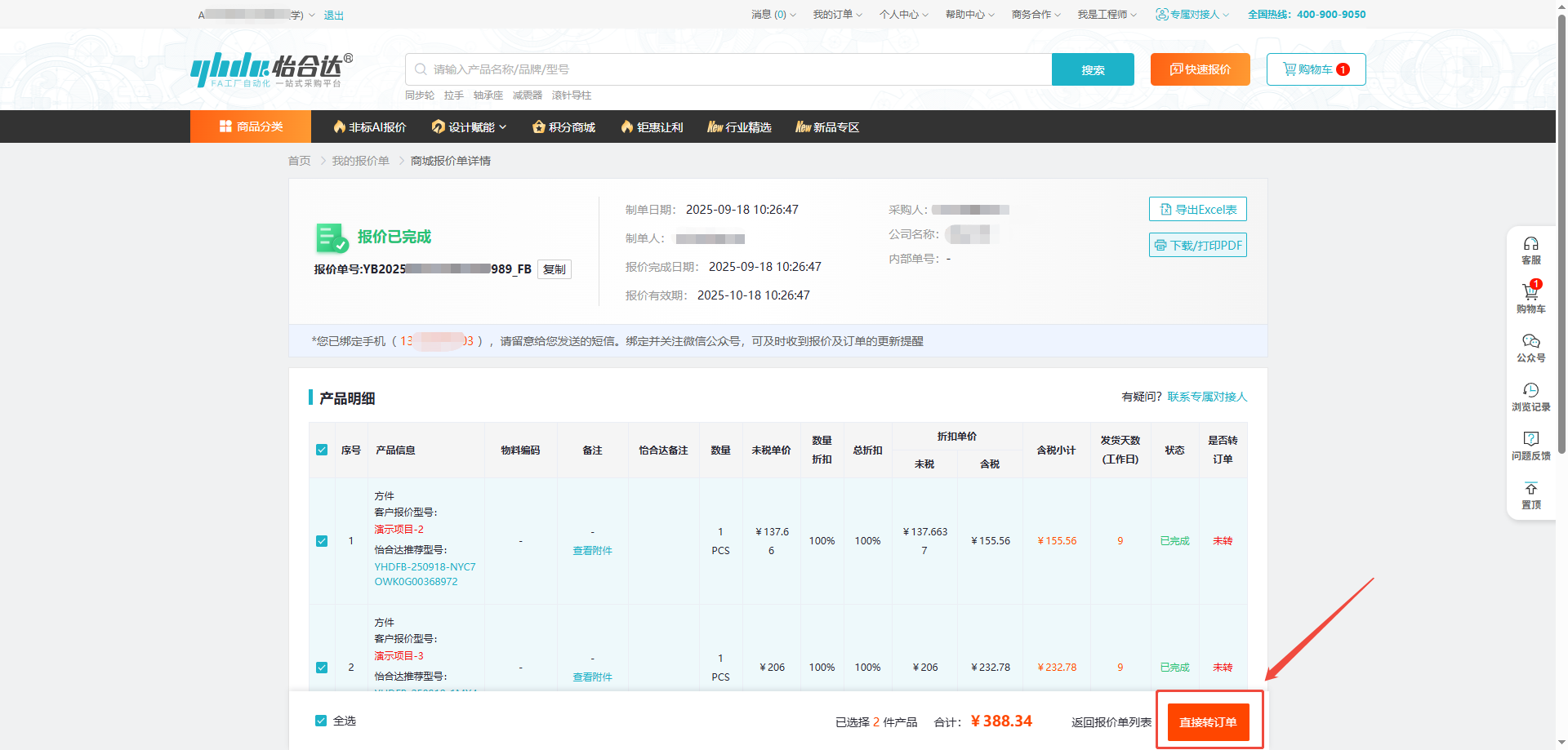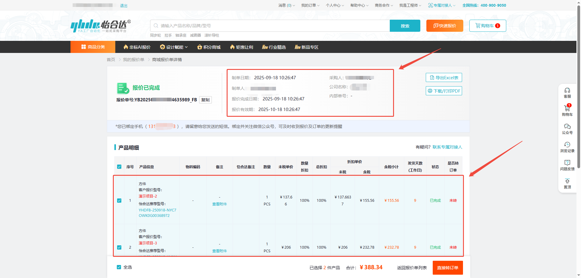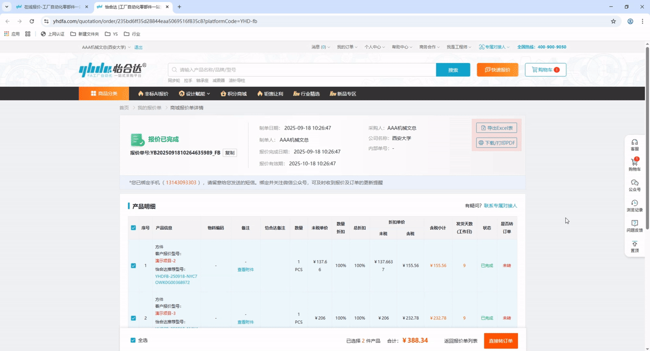 3、可以点击“下载/打印PDF”即可导出带有怡合达盖章的电子报价单,点击“导出Excel表”可导出Excel格式的报价单