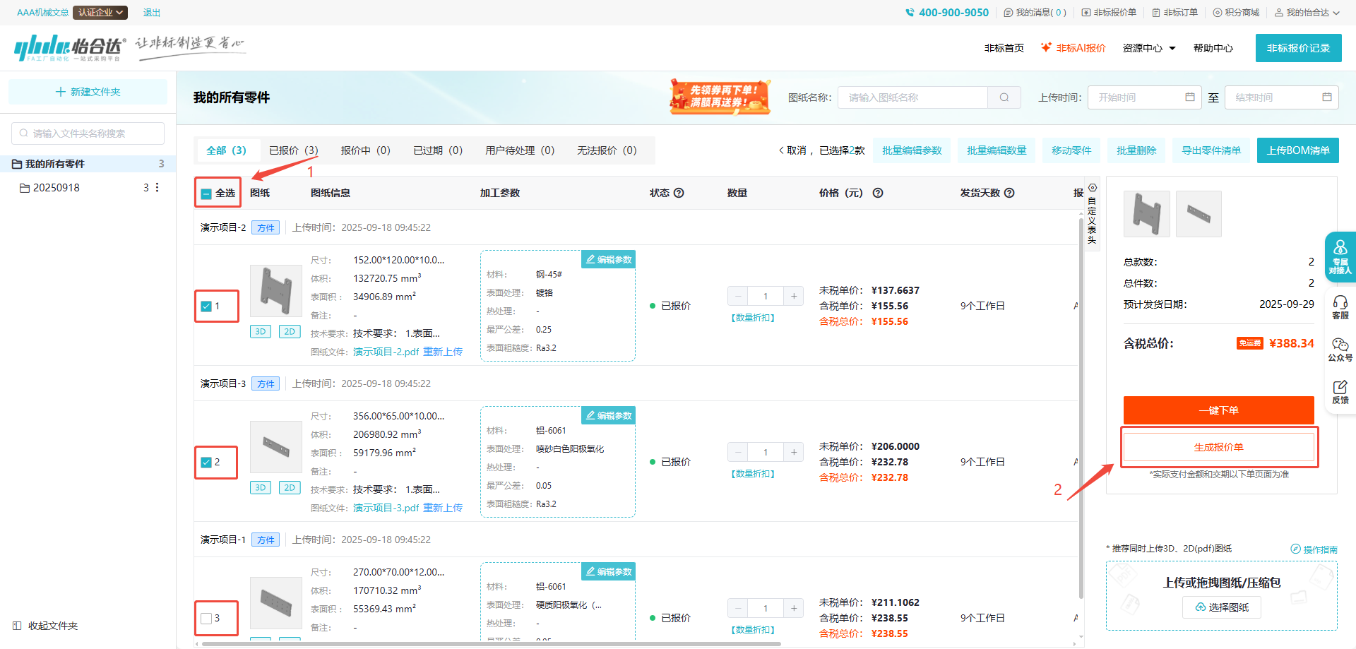 1、选中需要生成报价单的零件明细,点击“生成报价单”